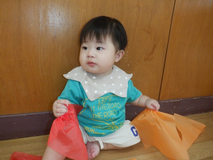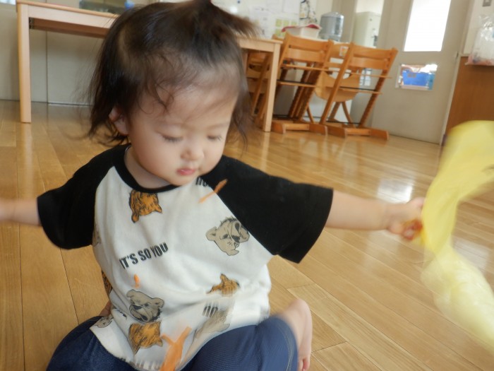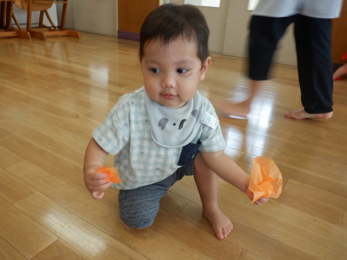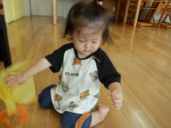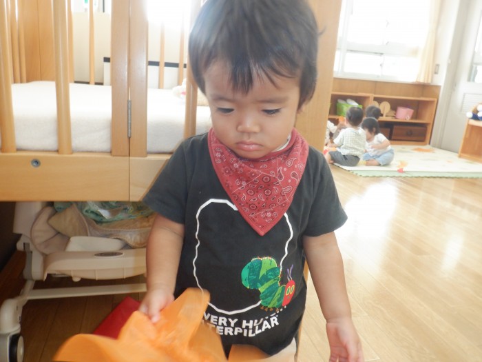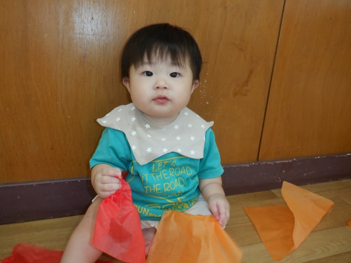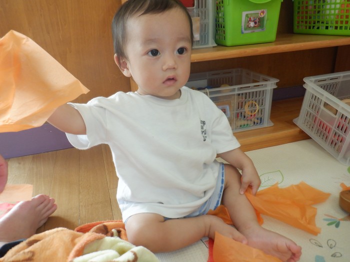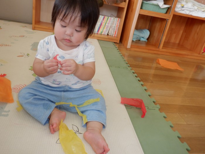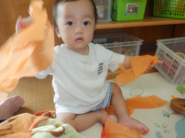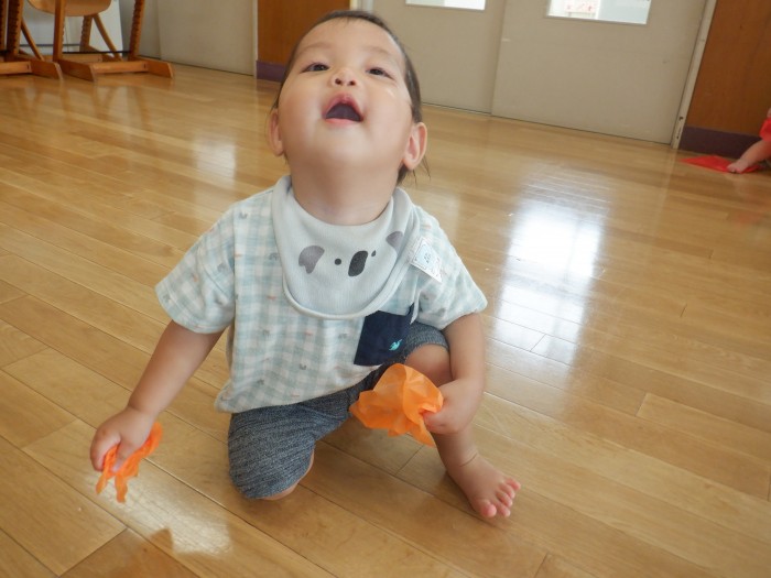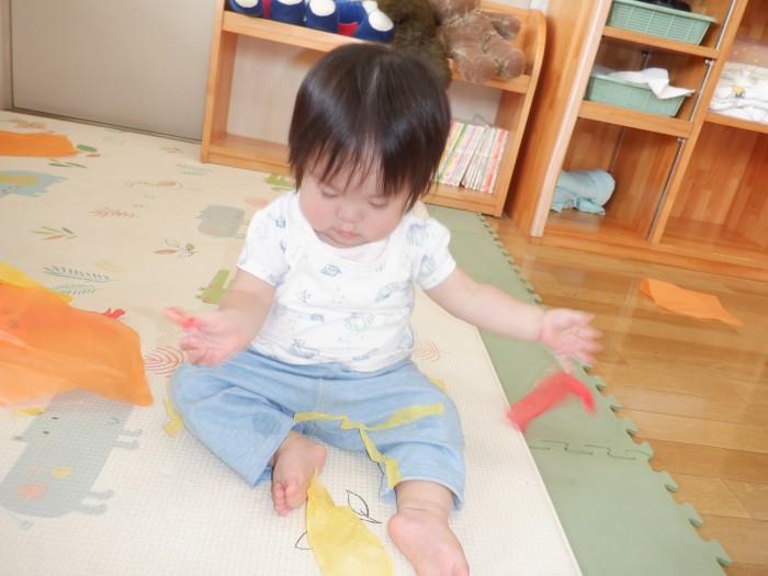 お花紙で遊びました。最初はひらひらしていてなんだか怖かったお友達も、慣れてくると「ちょうだい」と手を伸ばし、お花紙をもらうとクシャッと握ったり、ビリビリと破いたりして遊びました。