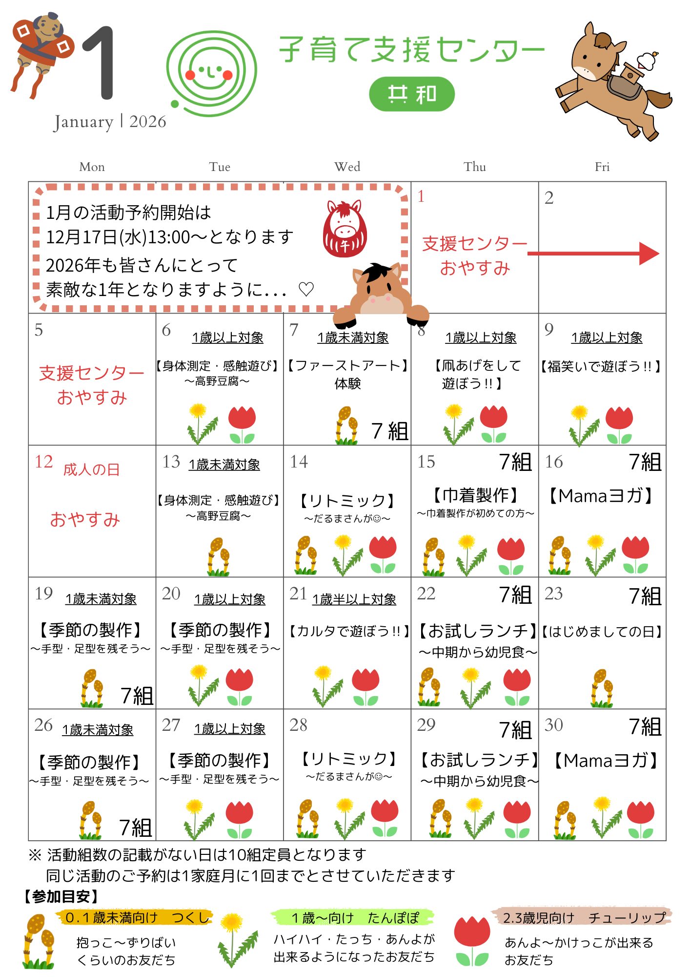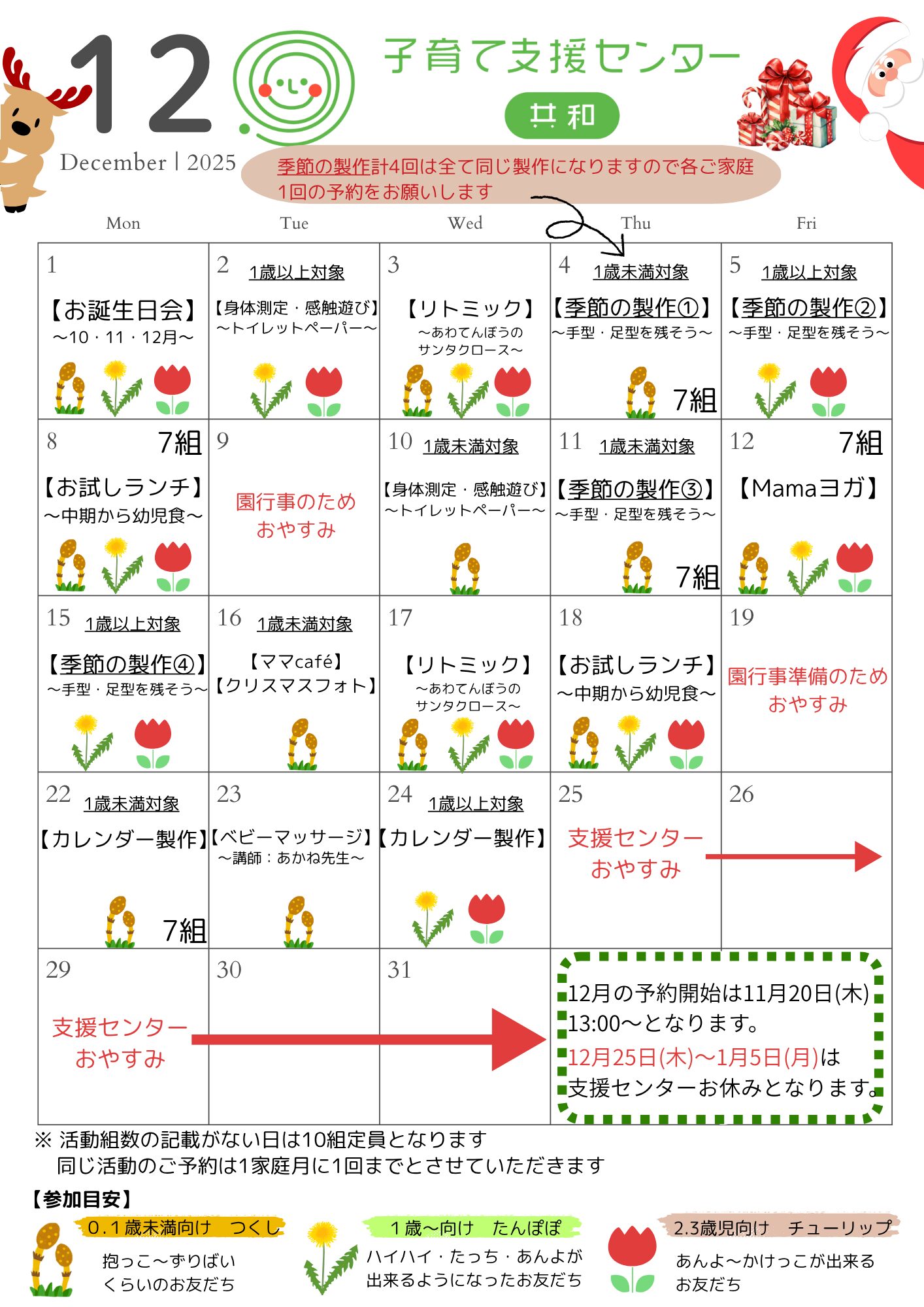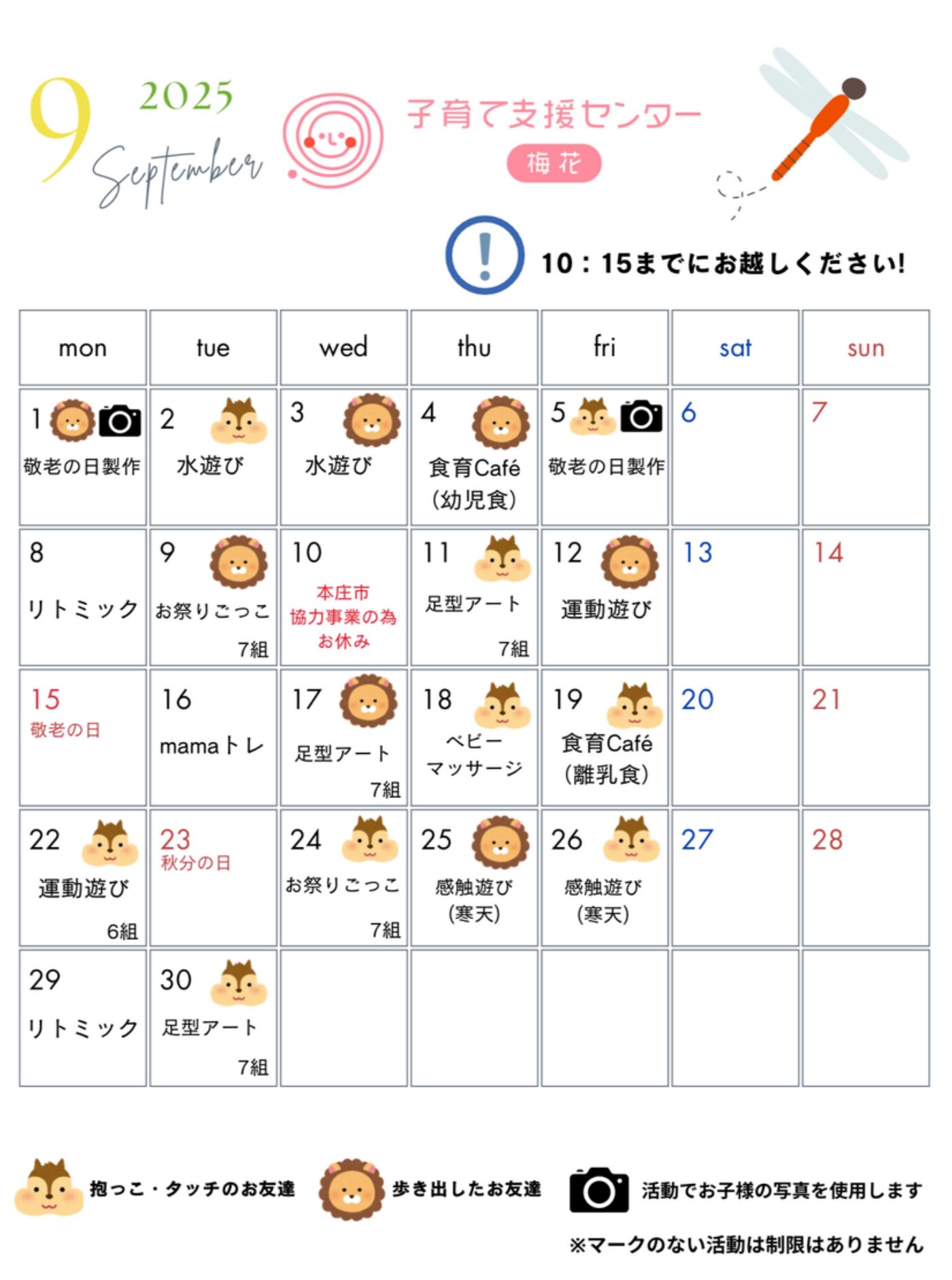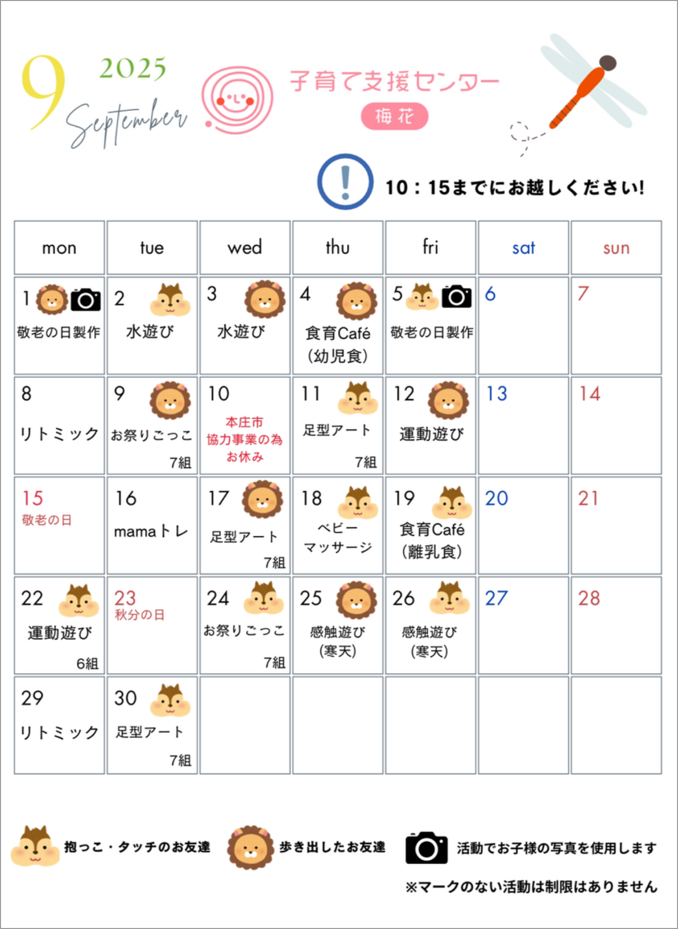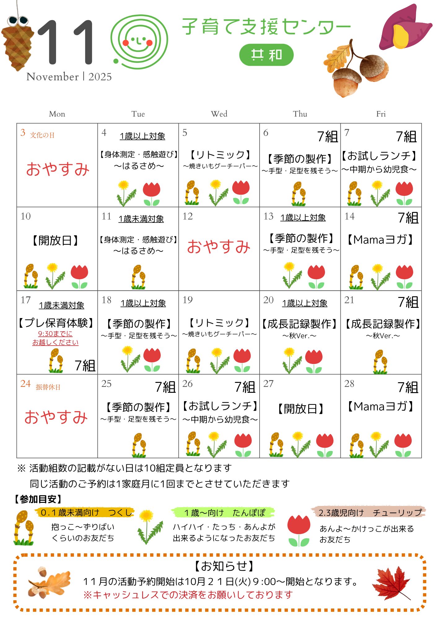 普段のお出かけに必要なものを持参ください。 使用済のおむつは支援センター内ゴミ箱をご利用ください。 授乳が必要な方は授乳ケープをご持参ください |