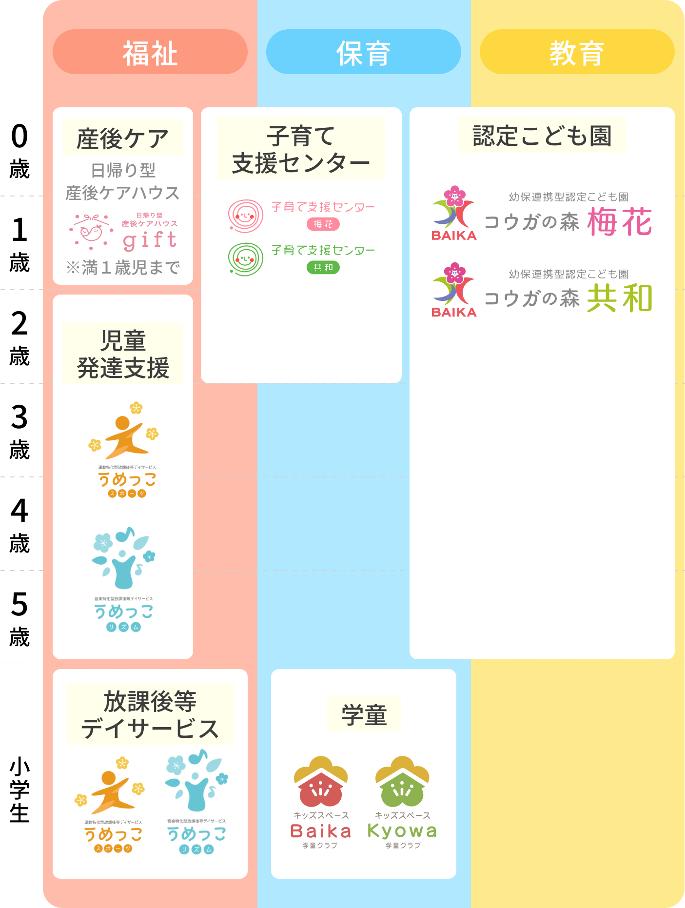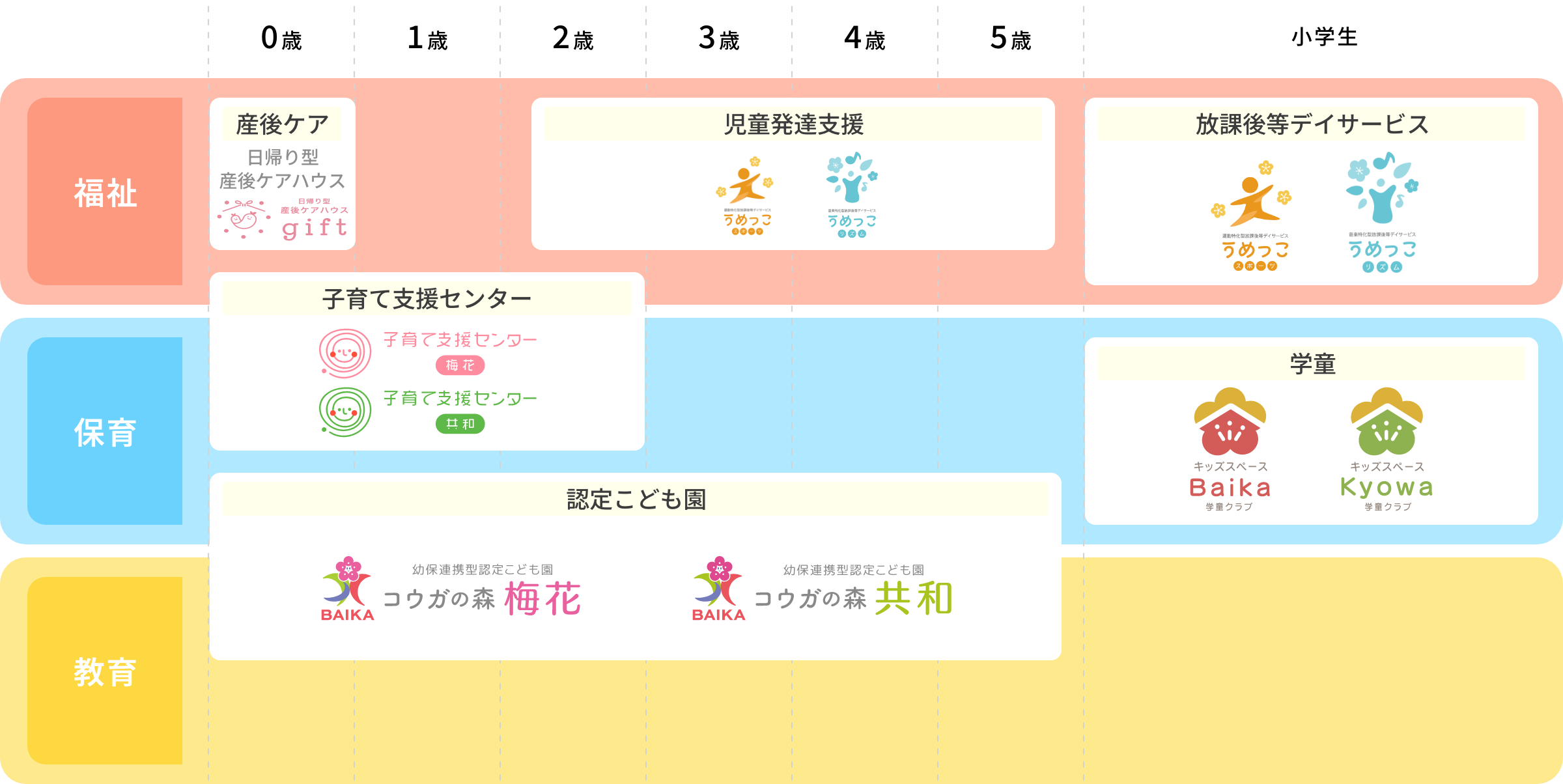産後ケア、子育て支援センター、認定こども園、学童クラブ、発達支援など、長期的で複合的なサービスによって、地域社会全体を支援し、次世代の育成に貢献しています。